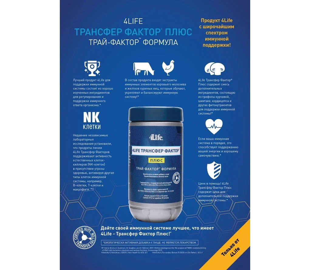 Трансфер Фактор™ Плюс Трай-Фактор™ формула компании 4Life Research™ – это фирменная формула, которая является основой данного продукта, сочетающая в своем составе лучшие